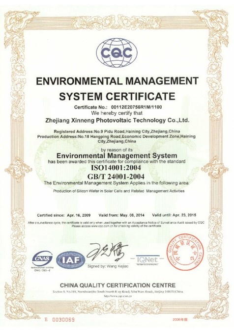 公司通過ISO14001:2004環(huán)境管理體系認(rèn)證 2009-04-16 00:00:00 浙江芯能光伏科技股份有限公司 Viewd 4291 Previous公司通過ISO9001:2000質(zhì)量管理體系認(rèn)證 Next浙江省科技廳常務(wù)副廳長壽劍剛蒞臨我司調(diào)研